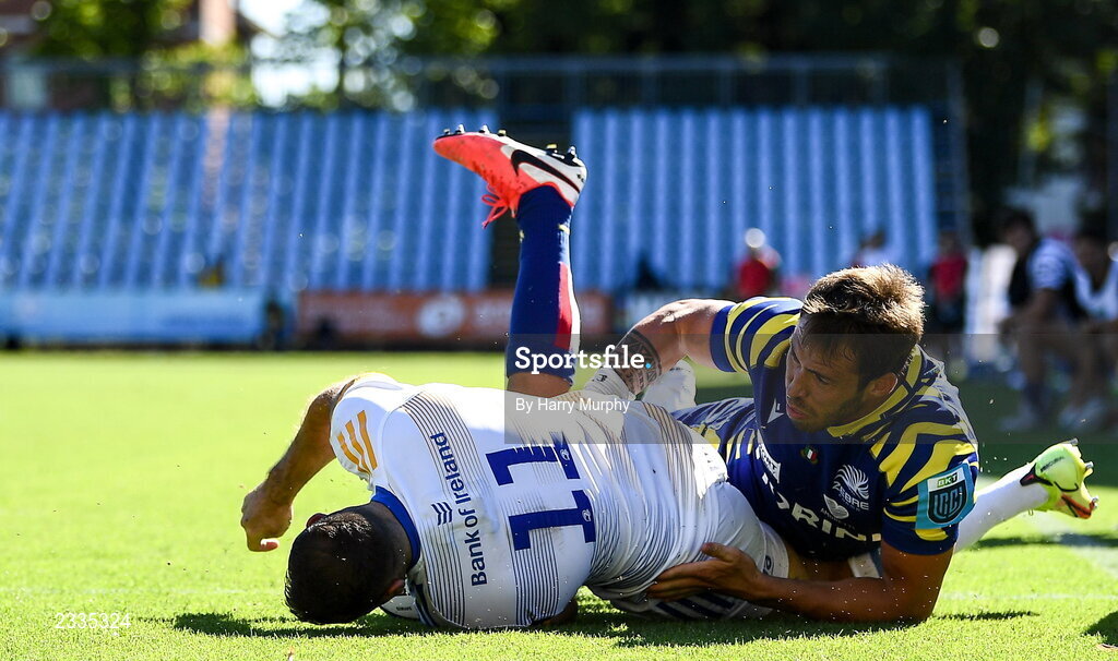17 September 2022; Dave Kearney of Leinster scores his side's fifth try despite the tackle of Jamie Osborne of Zebre Parma during the United Rugby Championship match between Zebre Parma and Leinster at Stadio Sergio Lanfranchi in Parma, Italy. Photo by Harry Murphy/Sportsfile