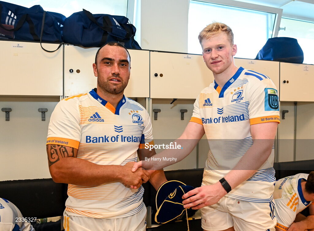 17 September 2022; Charlie Ngatai of Leinster is presented his first Leinster cap by teammate Jamie Osborne the United Rugby Championship match between Zebre Parma and Leinster at Stadio Sergio Lanfranchi in Parma, Italy. Photo by Harry Murphy/Sportsfile