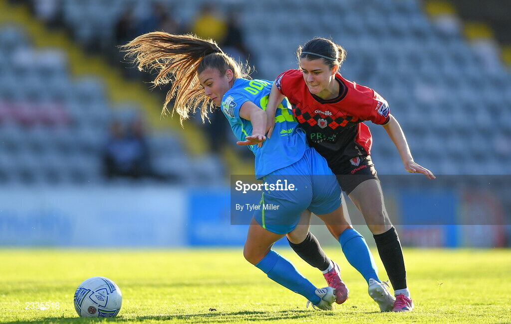 17 September 2022; Mia Dodd of DLR Waves in action against Kira Bates-Crosbie of Bohemians during the SSE Airtricity Women's National League match between Bohemians and DLR Waves at Dalymount Park in Dublin. Photo by Tyler Miller/Sportsfile