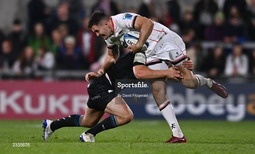 17 September 2022; Jacob Stockdale of Ulster is tackled by Tom Farrell of Connacht during the United Rugby Championship match between Ulster and Connacht at Kingspan Stadium in Belfast. Photo by David Fitzgerald/Sportsfile