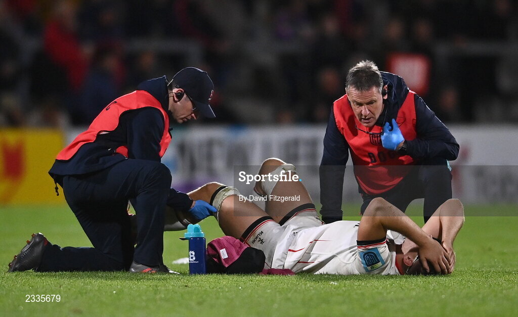 17 September 2022; Matty Rea of Ulster receives medical attention during the United Rugby Championship match between Ulster and Connacht at Kingspan Stadium in Belfast. Photo by David Fitzgerald/Sportsfile