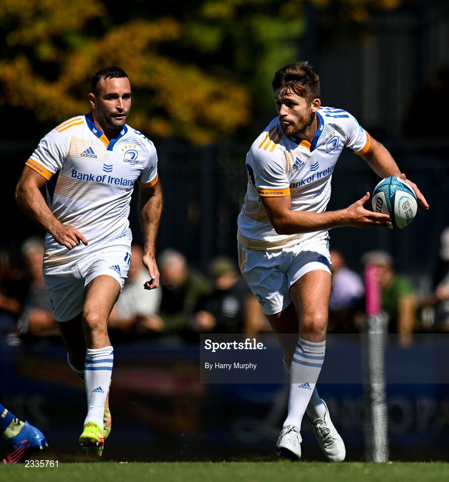 17 September 2022; Ross Byrne, right, and Dave Kearney of Leinster during the United Rugby Championship match between Zebre Parma and Leinster at Stadio Sergio Lanfranchi in Parma, Italy. Photo by Harry Murphy/Sportsfile