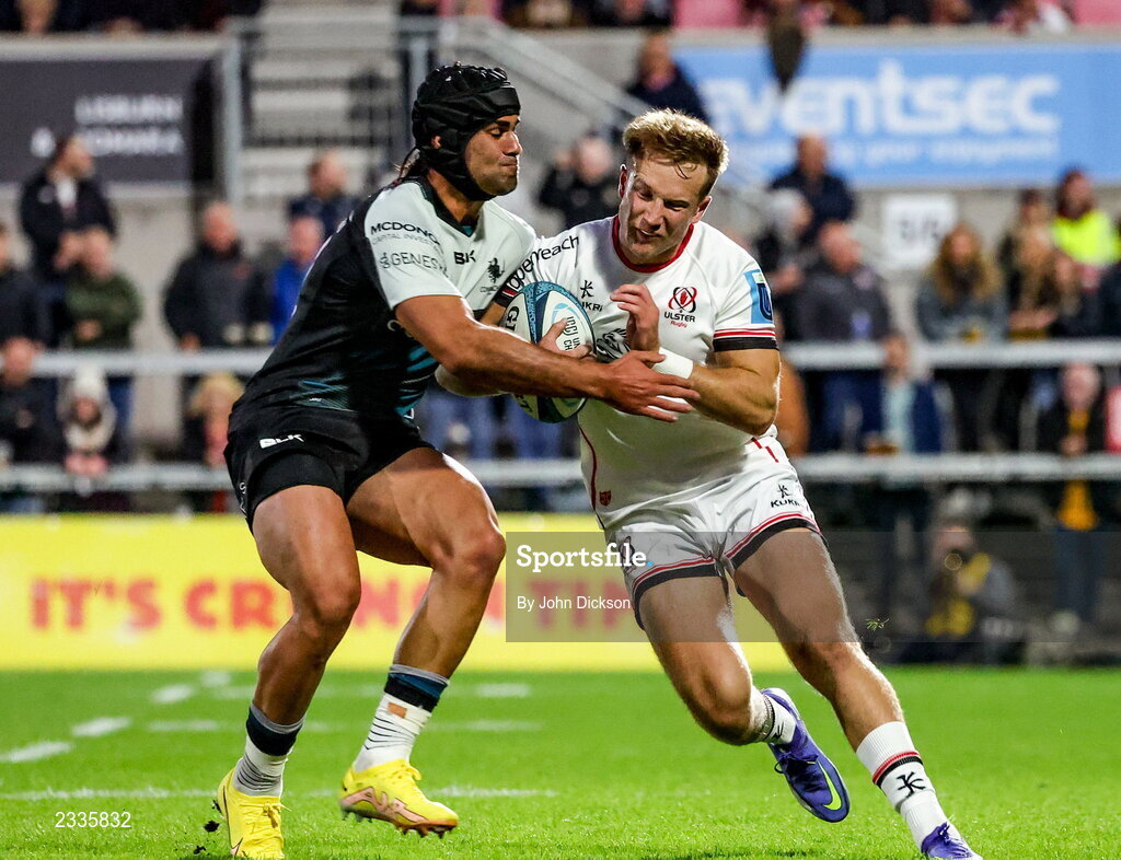 17 September 2022; Stewart Moore of Ulster is tackled by Byron Ralston of Connacht during the United Rugby Championship match between Ulster and Connacht at Kingspan Stadium in Belfast. Photo by John Dickson/Sportsfile