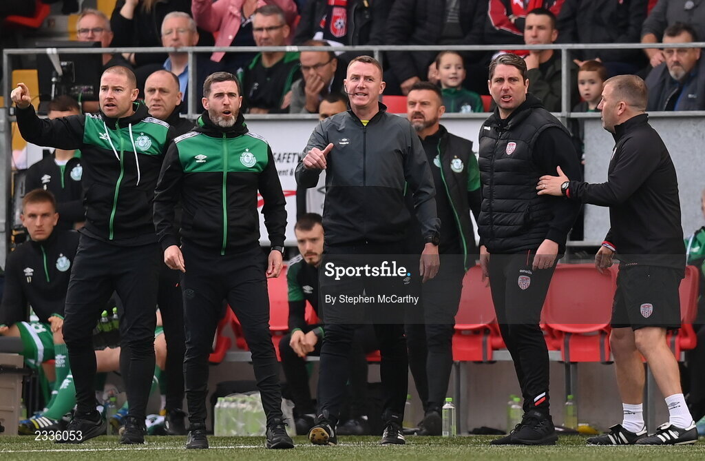 18 September 2022; Shamrock Rovers manager Stephen Bradley and Derry City manager Ruaidhrí Higgins during the Extra.ie FAI Cup Quarter-Final match between Derry City and Shamrock Rovers at The Ryan McBride Brandywell Stadium in Derry. Photo by Stephen McCarthy/Sportsfile