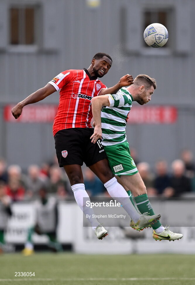 18 September 2022; Jack Byrne of Shamrock Rovers in action against Sadou Diallo of Derry City during the Extra.ie FAI Cup Quarter-Final match between Derry City and Shamrock Rovers at The Ryan McBride Brandywell Stadium in Derry. Photo by Stephen McCarthy/Sportsfile