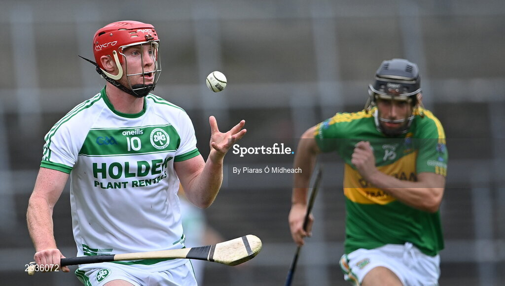 18 September 2022; Adrian Mullen of Shamrocks Ballyhale gathers possession as Mark Aylward of Glenmore closes in during the Kilkenny County Senior Club Hurling Championship Round 1 match between Shamrocks Ballyhale and Glenmore at UPMC Nowlan Park in Kilkenny. Photo by Piaras Ó Mídheach/Sportsfile