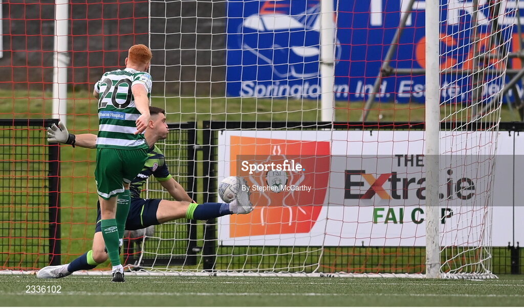 18 September 2022; Rory Gaffney of Shamrock Rovers shoots to score his side's first goal past Derry City goalkeeper Brian Maher during the Extra.ie FAI Cup Quarter-Final match between Derry City and Shamrock Rovers at The Ryan McBride Brandywell Stadium in Derry. Photo by Stephen McCarthy/Sportsfile