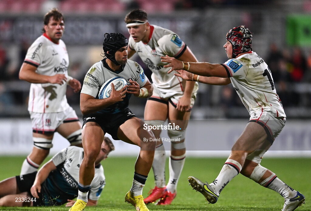 17 September 2022; Byron Ralston of Connacht in action against Luke Marshall of Ulster during the United Rugby Championship match between Ulster and Connacht at Kingspan Stadium in Belfast. Photo by David Fitzgerald/Sportsfile