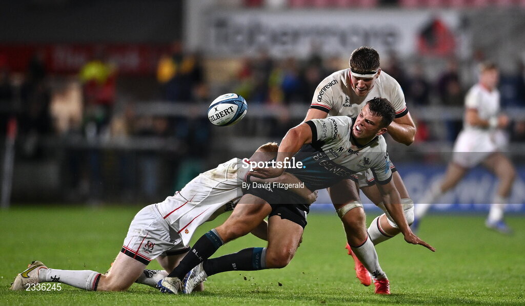 17 September 2022; Tom Farrell of Connacht is tackled by Nathan Doak of Ulster during the United Rugby Championship match between Ulster and Connacht at Kingspan Stadium in Belfast. Photo by David Fitzgerald/Sportsfile