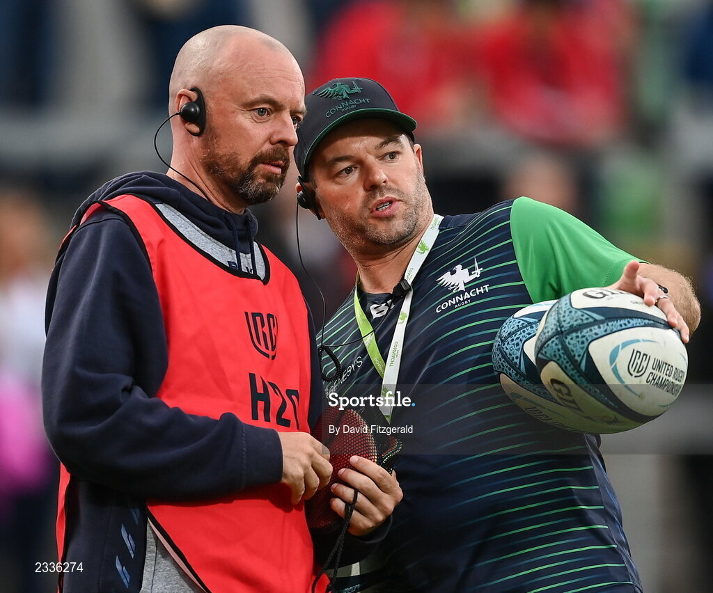 17 September 2022; Connacht logistics manager Martin Joyce, left, and attack & skills coach Mossy Lawler before the United Rugby Championship match between Ulster and Connacht at Kingspan Stadium in Belfast. Photo by David Fitzgerald/Sportsfile