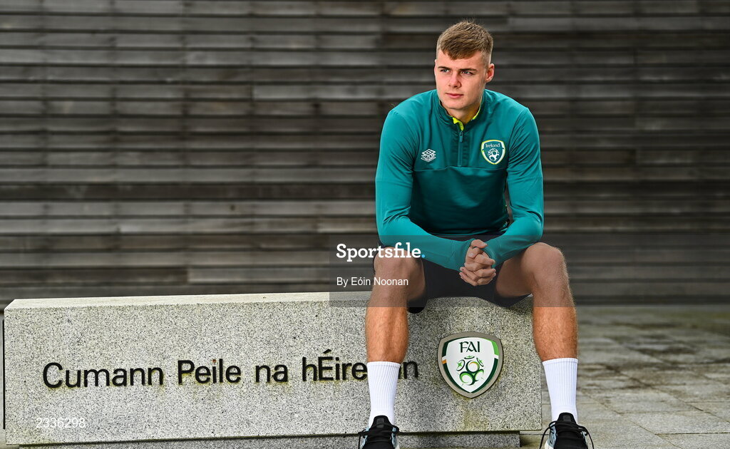 19 September 2022; Evan Ferguson sits for a portrait during a Republic of Ireland U21's press conference at FAI National Training Centre in Abbotstown, Dublin. Photo by Eóin Noonan/Sportsfile