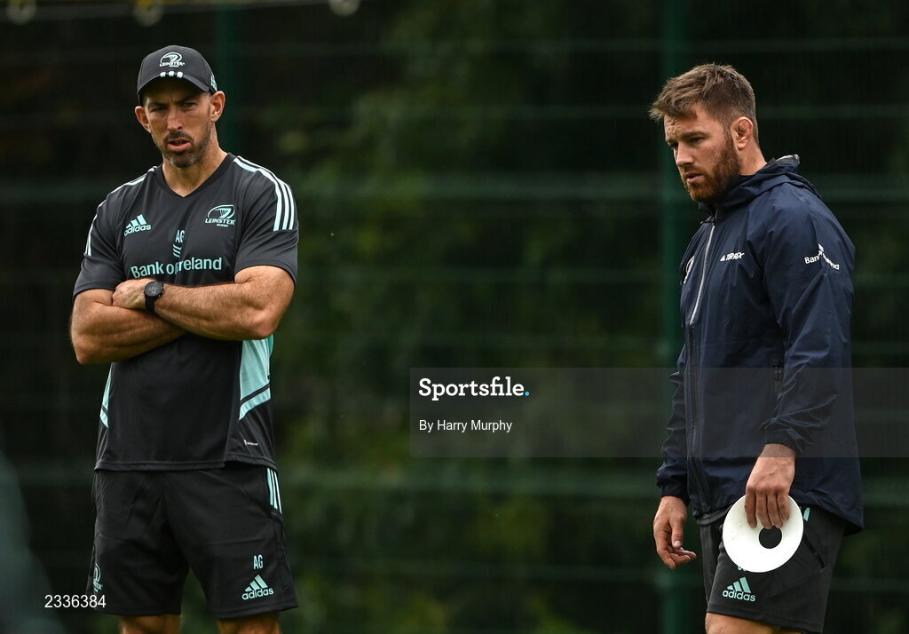 19 September 2022; Backs coach Andrew Goodman and contact skills coach Sean O'Brien during a Leinster Rugby squad training session at UCD in Dublin. Photo by Harry Murphy/Sportsfile