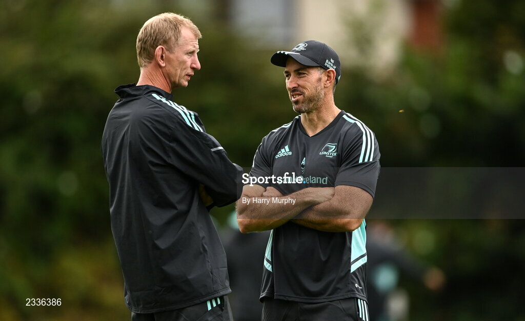 19 September 2022; Backs coach Andrew Goodman speaks with head coach Leo Cullen during a Leinster Rugby squad training session at UCD in Dublin. Photo by Harry Murphy/Sportsfile