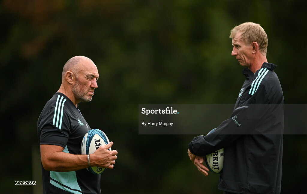 19 September 2022; Forwards and scrum coach Robin McBryde and head coach Leo Cullen during a Leinster Rugby squad training session at UCD in Dublin. Photo by Harry Murphy/Sportsfile