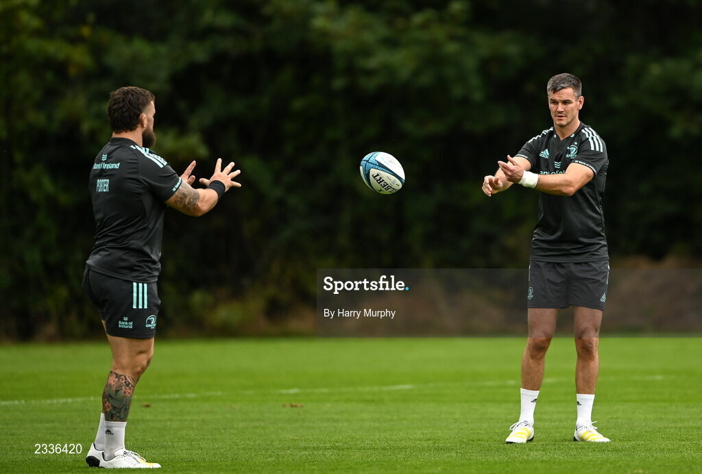19 September 2022; Jonathan Sexton and Andrew Porter during a Leinster Rugby squad training session at UCD in Dublin. Photo by Harry Murphy/Sportsfile