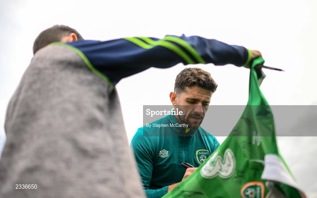 19 September 2022; Robbie Brady signs autographs for pupils from Latnamard National School, Monaghan, after a Republic of Ireland training session at the FAI National Training Centre in Abbotstown, Dublin. Photo by Stephen McCarthy/Sportsfile