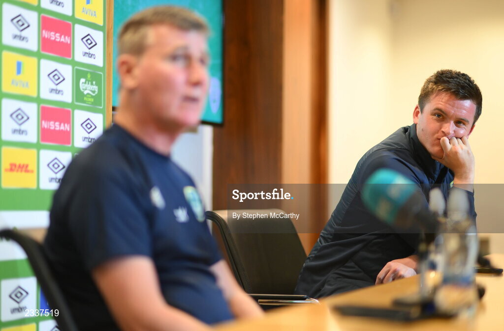 20 September 2022; Kieran Crowley, FAI communications manager, and manager Stephen Kenny during a Republic of Ireland press conference at the FAI National Training Centre in Abbotstown, Dublin. Photo by Stephen McCarthy/Sportsfile