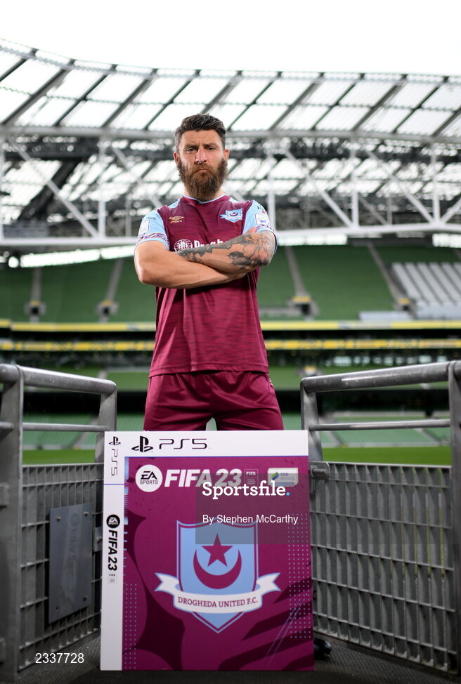 21 September 2022; Return of the packs! SSE Airtricity League FIFA 23 Club Packs are back! Featuring the individual club crest of all 10 Premier Division teams, these exclusive sleeves will be available to download free from https://www.ea.com/games/fifa/fifa-23 when the game launches Friday, 30th September! Gary Deegan of Drogheda United during the FIFA 23 SSE Airtricity League cover launch at Aviva Stadium in Dublin. Photo by Stephen McCarthy/Sportsfile