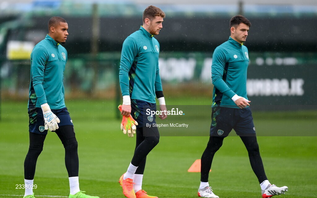 22 September 2022; Goalkeepers, from left, Gavin Bazunu, Mark Travers and Max O'Leary during a Republic of Ireland training session at the FAI National Training Centre in Abbotstown, Dublin. Photo by Stephen McCarthy/Sportsfile