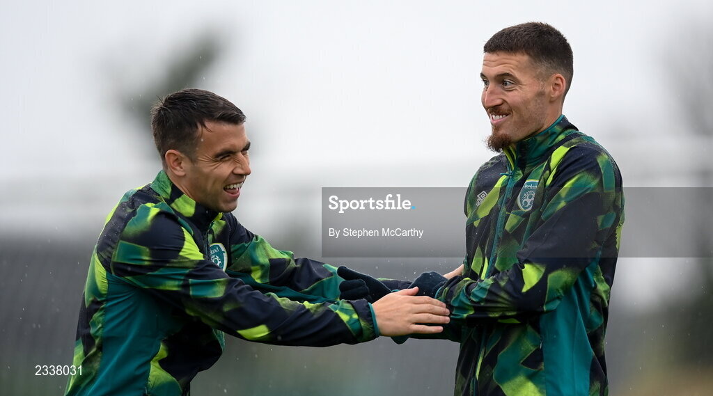 22 September 2022; Matt Doherty, right, with Seamus Coleman during a Republic of Ireland training session at the FAI National Training Centre in Abbotstown, Dublin. Photo by Stephen McCarthy/Sportsfile