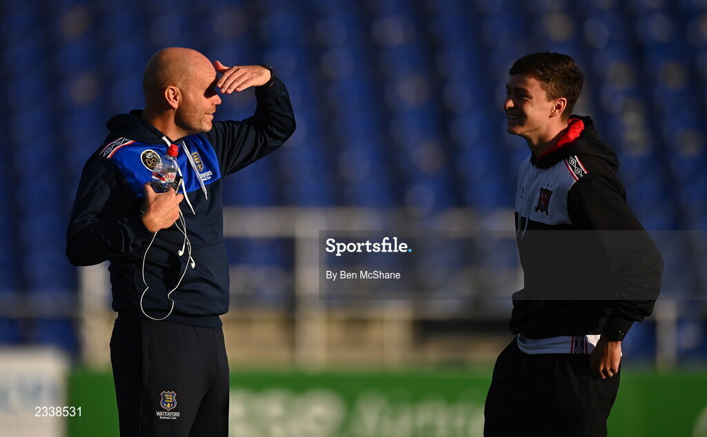 16 September 2022; Waterford head coach Danny Searle and Alfie Lewis of Dundalk before the Extra.ie FAI Cup Quarter-Final match between Waterford and Dundalk at the RSC in Waterford. Photo by Ben McShane/Sportsfile