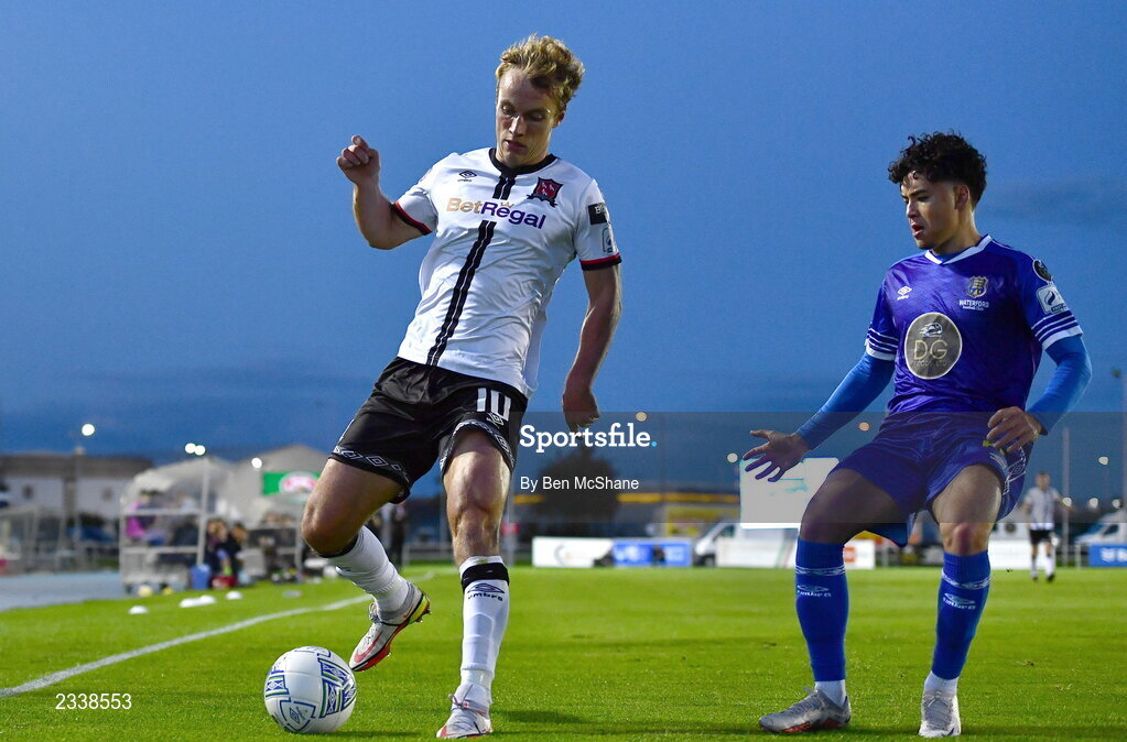 16 September 2022; Greg Sloggett of Dundalk and Phoenix Patterson of Waterford during the Extra.ie FAI Cup Quarter-Final match between Waterford and Dundalk at the RSC in Waterford. Photo by Ben McShane/Sportsfile
