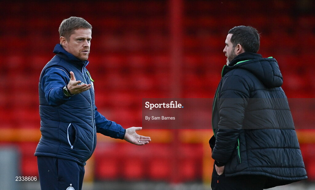 22 September 2022; Shelbourne manager Damien Duff, left, and Shamrock Rovers manager Stephen Bradley in conversation before the SSE Airtricity League Premier Division match between Shelbourne and Shamrock Rovers at Tolka Park in Dublin. Photo by Sam Barnes/Sportsfile