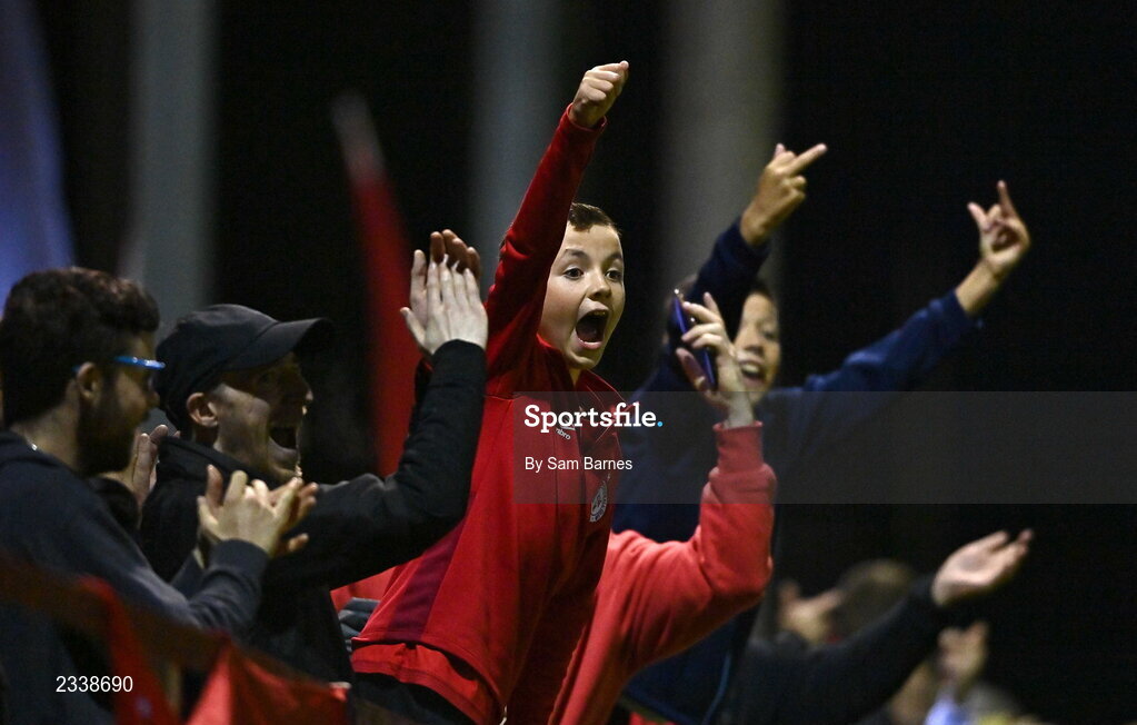 22 September 2022; A young Shelbourne supporter celebrates at the final whistle during the SSE Airtricity League Premier Division match between Shelbourne and Shamrock Rovers at Tolka Park in Dublin. Photo by Sam Barnes/Sportsfile