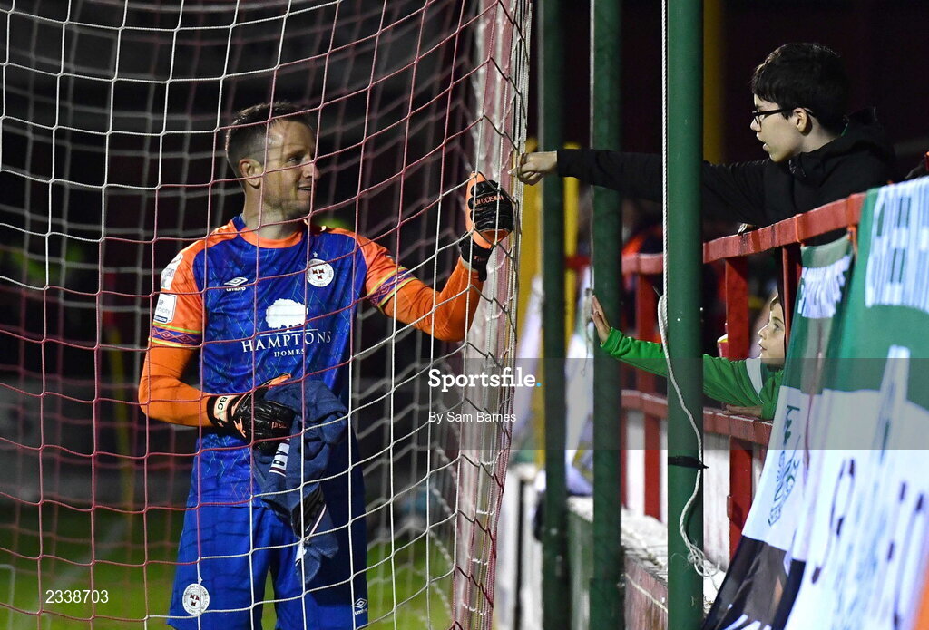 22 September 2022; Shelbourne goalkeeper Brendan Clarke bumps fists with a young Shamrock Rovers supporter during the SSE Airtricity League Premier Division match between Shelbourne and Shamrock Rovers at Tolka Park in Dublin. Photo by Sam Barnes/Sportsfile