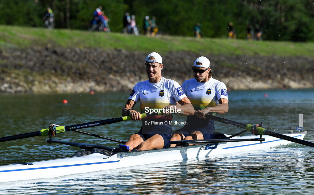 22 September 2022; Domantas Stankunas, left, and Dovydas Stankunas of Lithuania compete in the Men's Pair semi-final A/B 2 during day 5 of the World Rowing Championships 2022 at Racice in Czech Republic. Photo by Piaras Ó Mídheach/Sportsfile