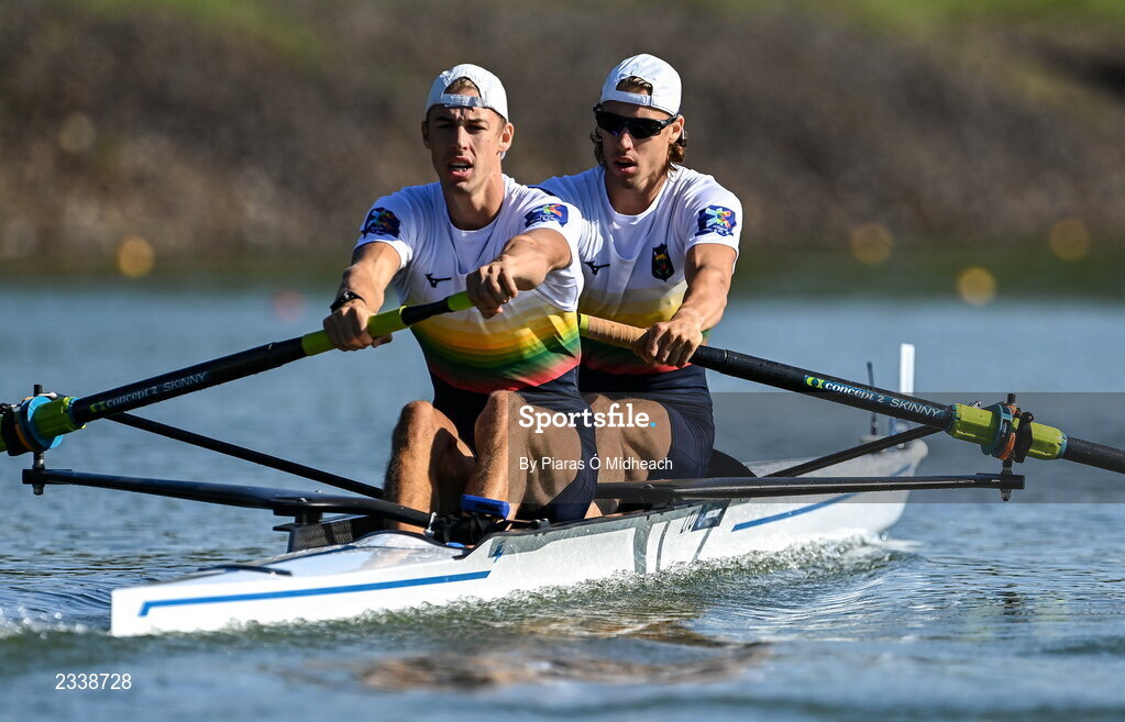 22 September 2022; Domantas Stankunas, left, and Dovydas Stankunas of Lithuania compete in the Men's Pair semi-final A/B 2 during day 5 of the World Rowing Championships 2022 at Racice in Czech Republic. Photo by Piaras Ó Mídheach/Sportsfile
