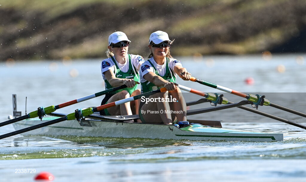 22 September 2022; Aoife Casey, left, and Margaret Cremen of Ireland compete in the Lightweight Women's Double Sculls semi-final A/B 1 during day 5 of the World Rowing Championships 2022 at Racice in Czech Republic. Photo by Piaras Ó Mídheach/Sportsfile