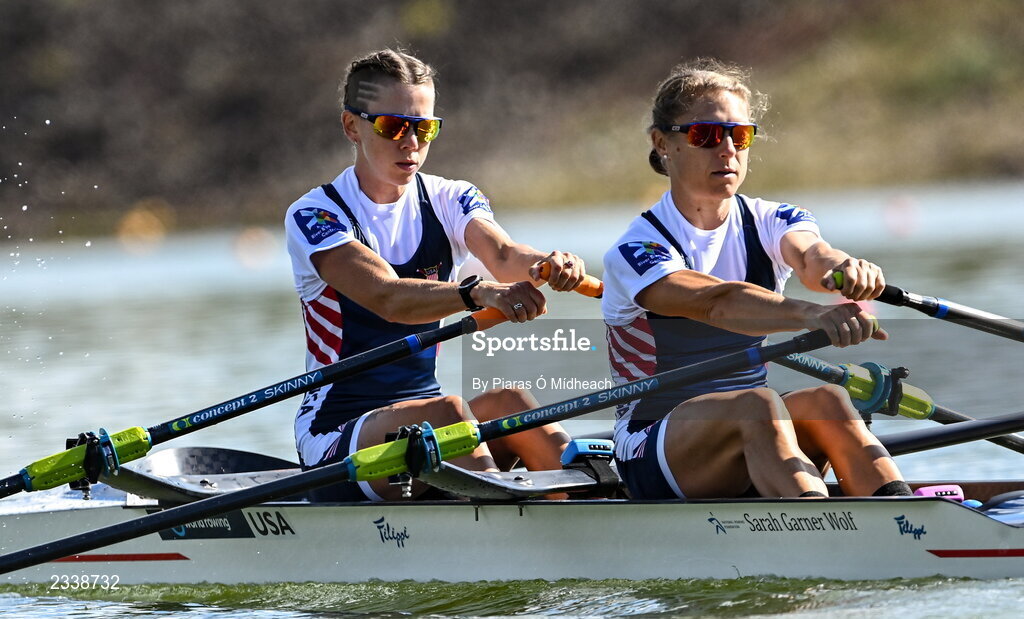 22 September 2022; Mary Reckford, left, and Michelle Sechser of USA compete in the Lightweight Women's Double Sculls semi-final A/B 2 during day 5 of the World Rowing Championships 2022 at Racice in Czech Republic. Photo by Piaras Ó Mídheach/Sportsfile