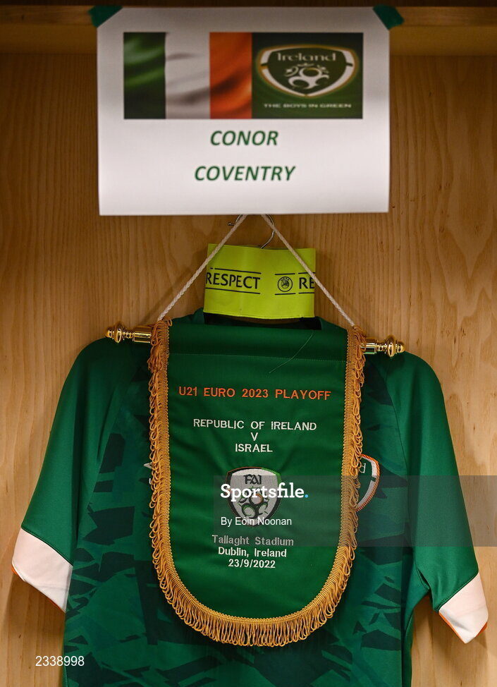 23 September 2022; A view of the match jersey and match pennant assigned to Republic of Ireland captain Conor Coventry before the UEFA European U21 Championship play-off first leg match between Republic of Ireland and Israel at Tallaght Stadium in Dublin. Photo by Eóin Noonan/Sportsfile