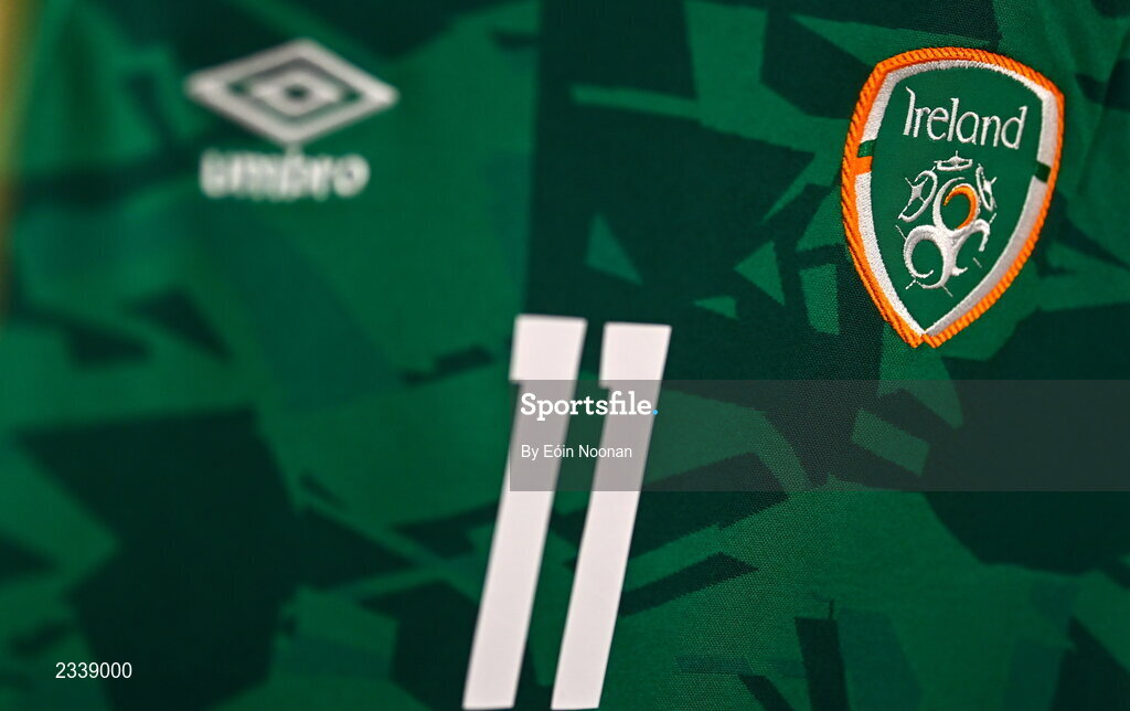 23 September 2022; A detailed view of the Republic of Ireland crest on the jersey assigned to Aaron Connolly before the UEFA European U21 Championship play-off first leg match between Republic of Ireland and Israel at Tallaght Stadium in Dublin. Photo by Eóin Noonan/Sportsfile