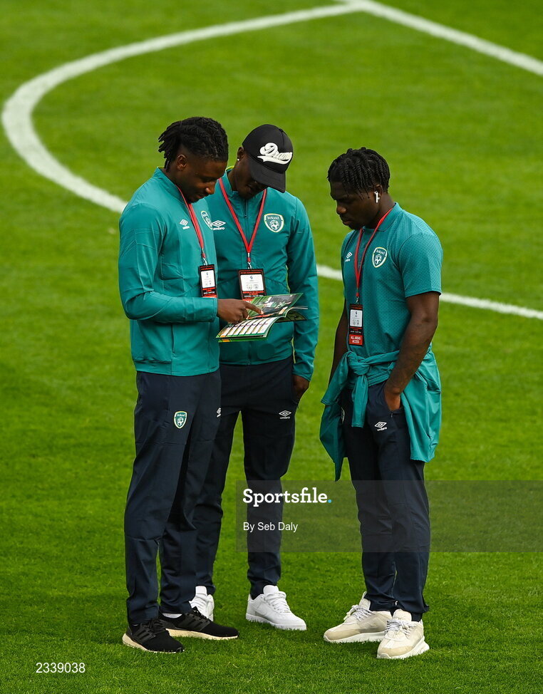 23 September 2022; Republic of Ireland players, from left, Joshua Kayode, Ademipo Odubeko and Festy Ebosele before the UEFA European U21 Championship play-off first leg match between Republic of Ireland and Israel at Tallaght Stadium in Dublin. Photo by Seb Daly/Sportsfile