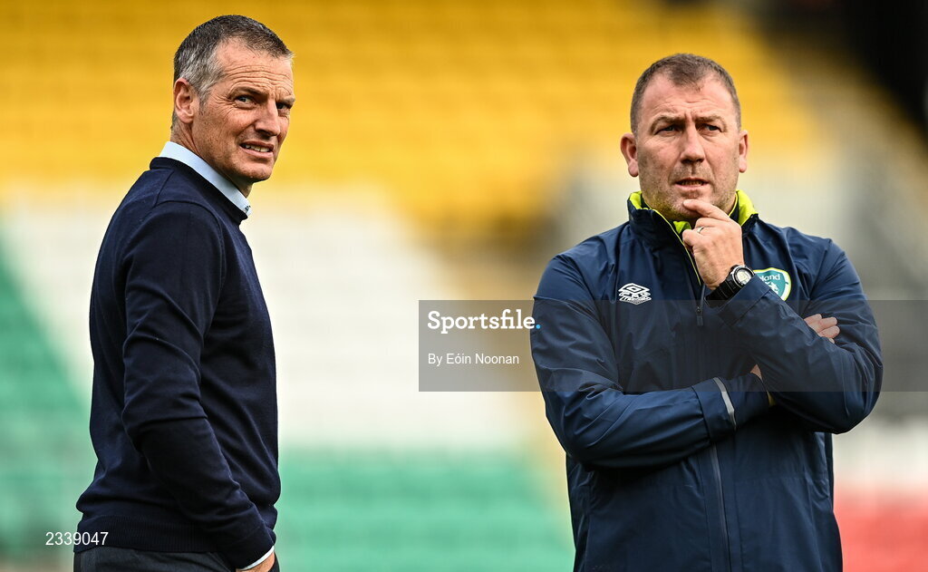 23 September 2022; Republic of Ireland manager Jim Crawford, left, and Republic of Ireland assistant manager Alan Reynolds before the UEFA European U21 Championship play-off first leg match between Republic of Ireland and Israel at Tallaght Stadium in Dublin. Photo by Eóin Noonan/Sportsfile