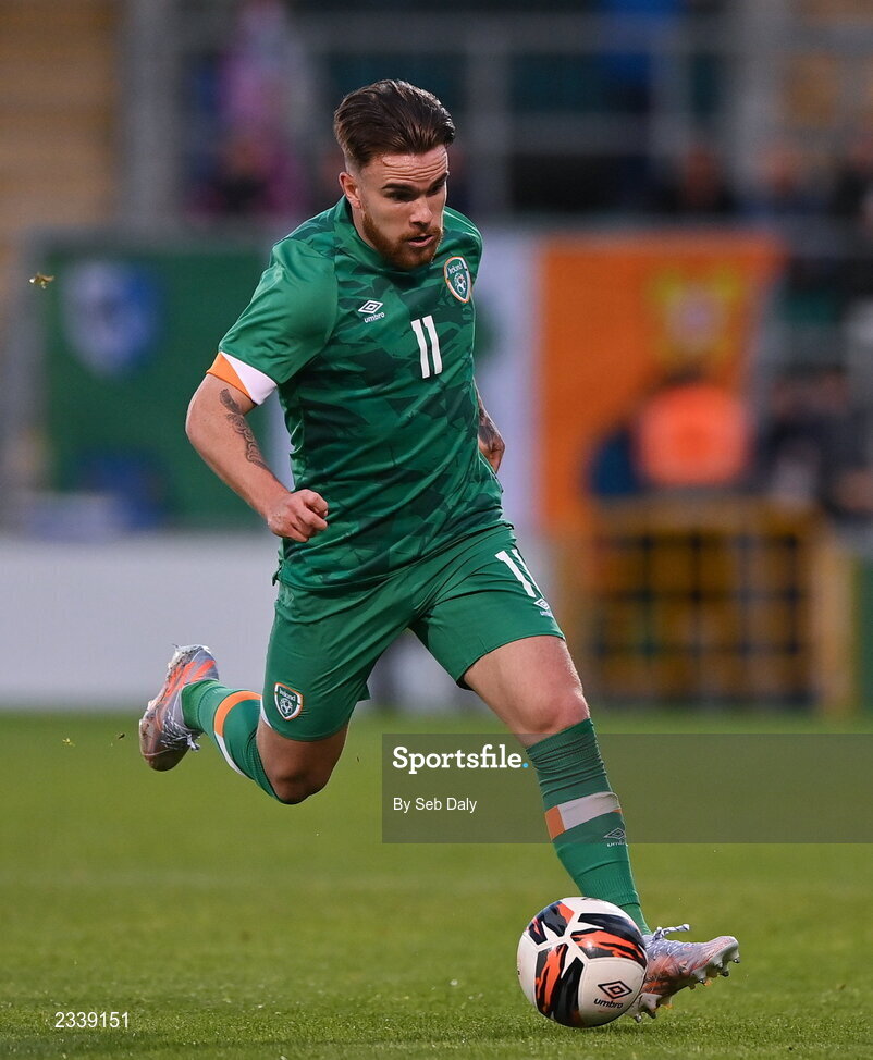 23 September 2022; Aaron Connolly of Republic of Ireland during the UEFA European U21 Championship play-off first leg match between Republic of Ireland and Israel at Tallaght Stadium in Dublin. Photo by Seb Daly/Sportsfile