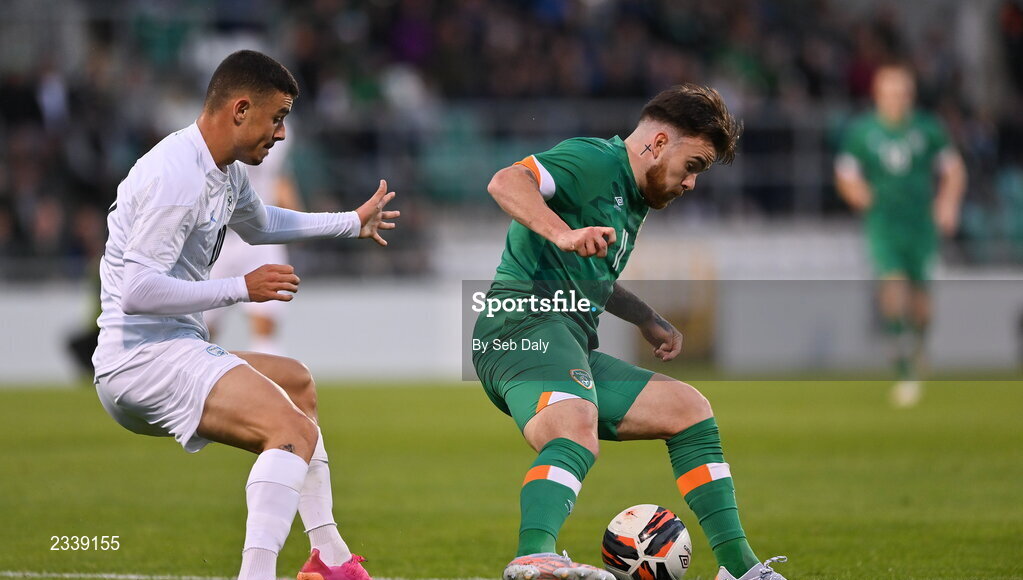 23 September 2022; Aaron Connolly of Republic of Ireland in action against Stav Lemkin of Israel during the UEFA European U21 Championship play-off first leg match between Republic of Ireland and Israel at Tallaght Stadium in Dublin. Photo by Seb Daly/Sportsfile