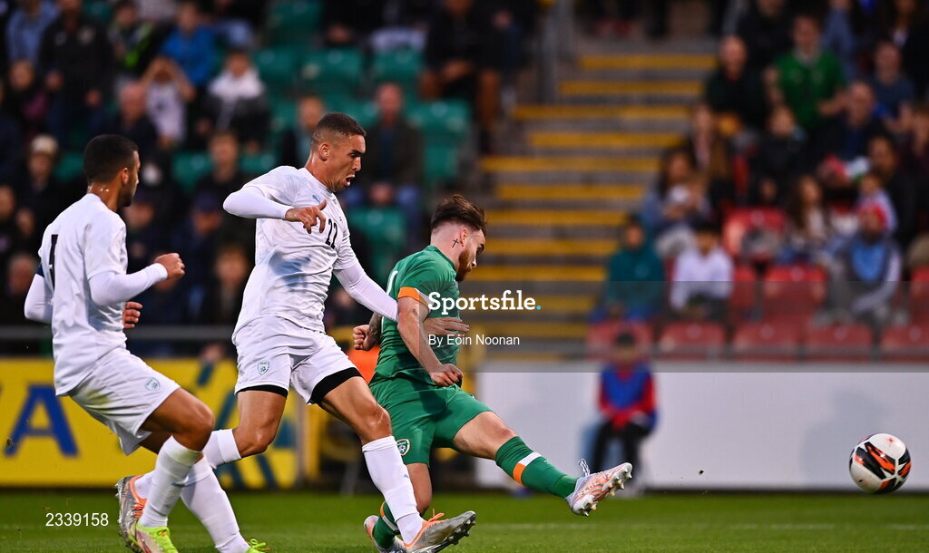 23 September 2022; Aaron Connolly of Republic of Ireland shoots at goal during the UEFA European U21 Championship play-off first leg match between Republic of Ireland and Israel at Tallaght Stadium in Dublin. Photo by Eóin Noonan/Sportsfile