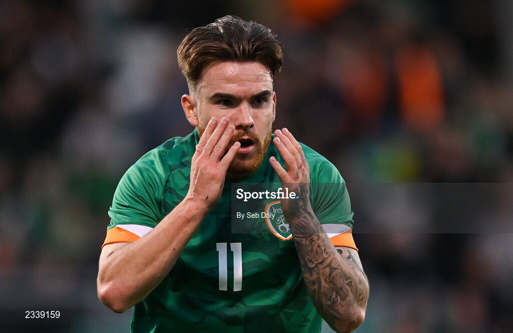 23 September 2022; Aaron Connolly of Republic of Ireland reacts after his shot was saved during the UEFA European U21 Championship play-off first leg match between Republic of Ireland and Israel at Tallaght Stadium in Dublin. Photo by Seb Daly/Sportsfile