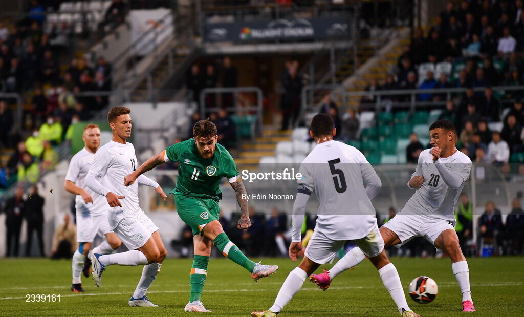 23 September 2022; Aaron Connolly of Republic of Ireland shoots at goal during the UEFA European U21 Championship play-off first leg match between Republic of Ireland and Israel at Tallaght Stadium in Dublin. Photo by Eóin Noonan/Sportsfile