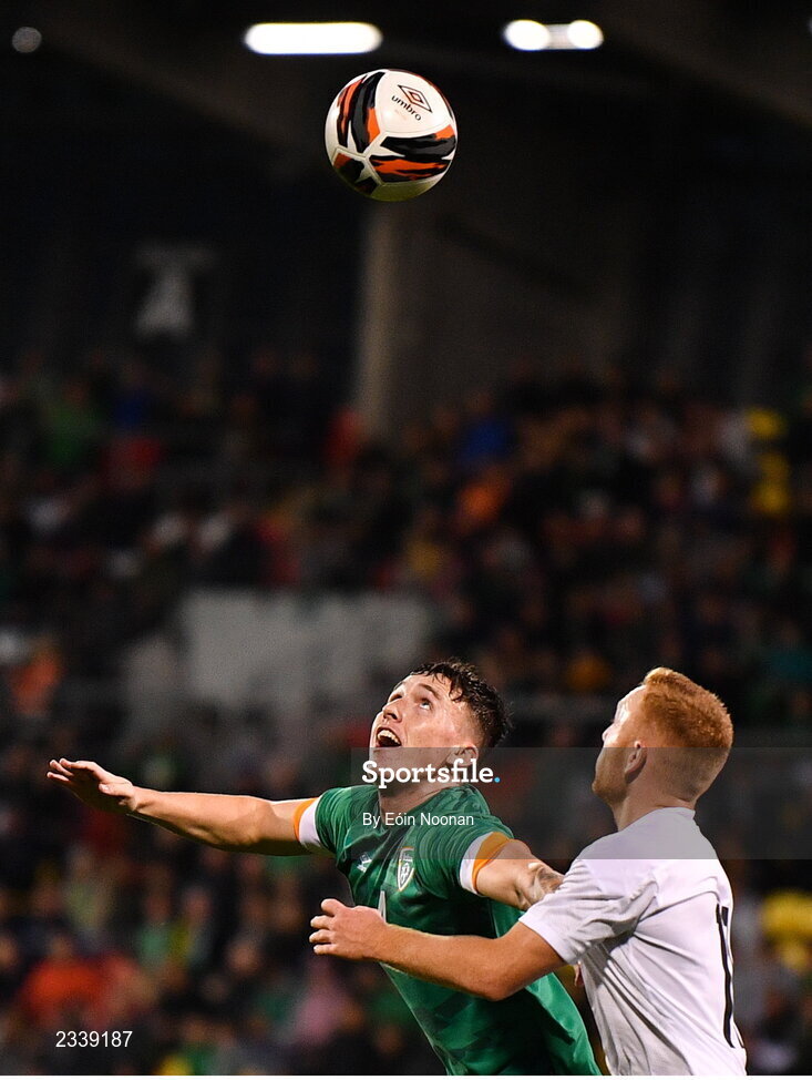 23 September 2022; Joe Redmond of Republic of Ireland in action against Ido Shahar of Israel during the UEFA European U21 Championship play-off first leg match between Republic of Ireland and Israel at Tallaght Stadium in Dublin. Photo by Eóin Noonan/Sportsfile