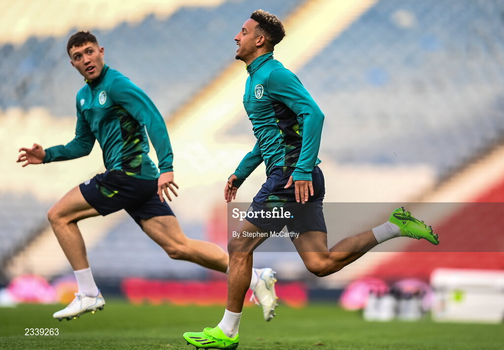 23 September 2022; Callum Robinson and Dara O'Shea, left, during a Republic of Ireland training session at Hampden Park in Glasgow, Scotland. Photo by Stephen McCarthy/Sportsfile