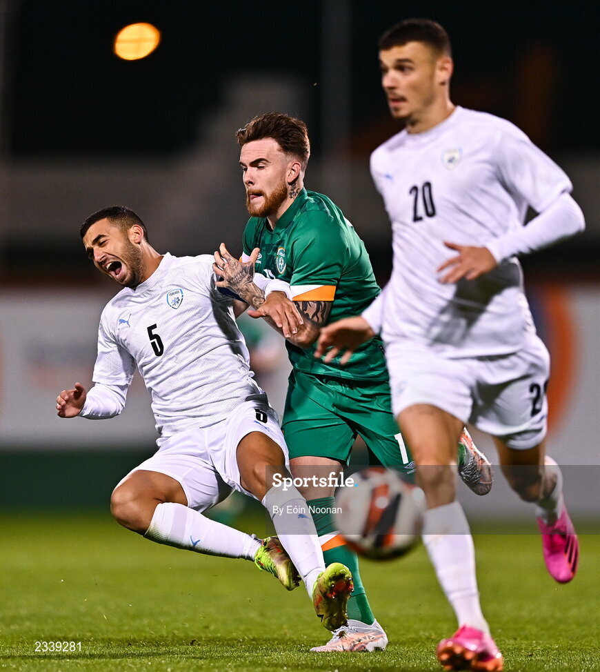 23 September 2022; Aaron Connolly of Republic of Ireland in action against Yoav Hofmeister of Israel during the UEFA European U21 Championship play-off first leg match between Republic of Ireland and Israel at Tallaght Stadium in Dublin. Photo by Eóin Noonan/Sportsfile