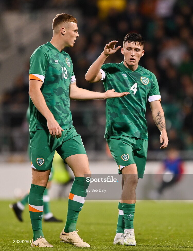 23 September 2022; Jake O'Brien, left, and Joe Redmond of Republic of Ireland during the UEFA European U21 Championship play-off first leg match between Republic of Ireland and Israel at Tallaght Stadium in Dublin. Photo by Seb Daly/Sportsfile