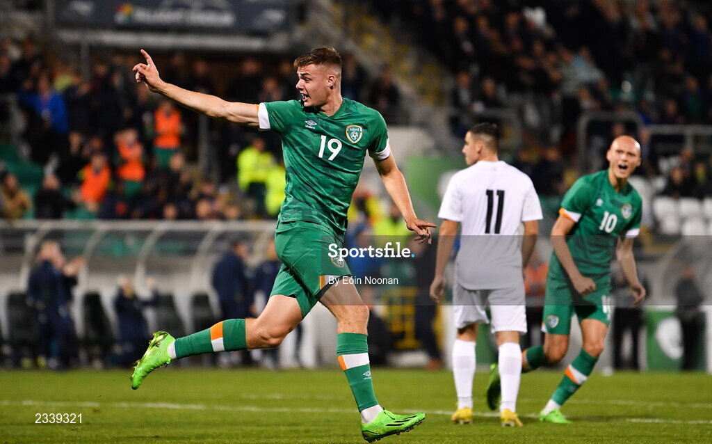 23 September 2022; Evan Ferguson of Republic of Ireland celebrates after scoring his side's first goal during the UEFA European U21 Championship play-off first leg match between Republic of Ireland and Israel at Tallaght Stadium in Dublin. Photo by Eóin Noonan/Sportsfile
