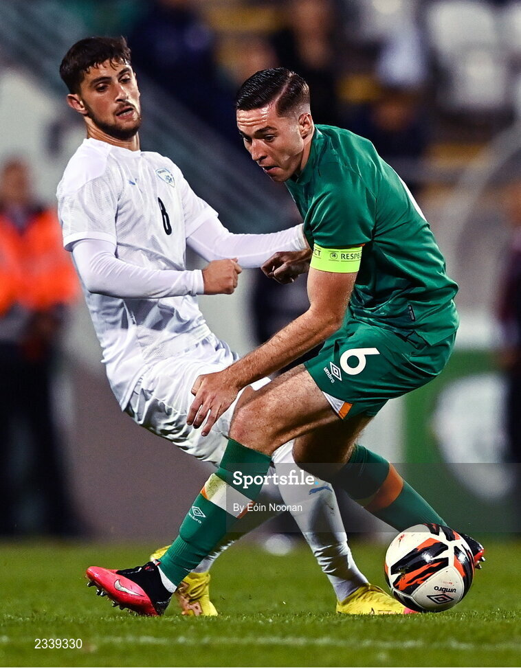 23 September 2022; Conor Coventry of Republic of Ireland in action against Mohammad Kanaan of Israel during the UEFA European U21 Championship play-off first leg match between Republic of Ireland and Israel at Tallaght Stadium in Dublin. Photo by Eóin Noonan/Sportsfile