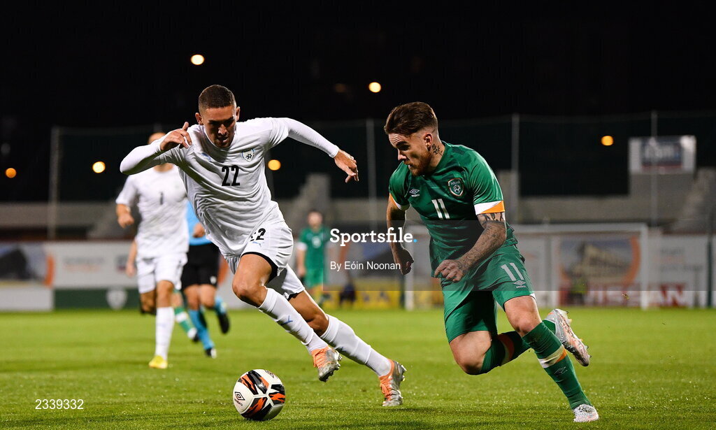 23 September 2022; Aaron Connolly of Republic of Ireland in action against Roi Herman of Israel during the UEFA European U21 Championship play-off first leg match between Republic of Ireland and Israel at Tallaght Stadium in Dublin. Photo by Eóin Noonan/Sportsfile