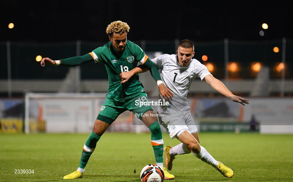 23 September 2022; Tyreik Wright of Republic of Ireland in action against Osher Davida of Israel during the UEFA European U21 Championship play-off first leg match between Republic of Ireland and Israel at Tallaght Stadium in Dublin. Photo by Eóin Noonan/Sportsfile